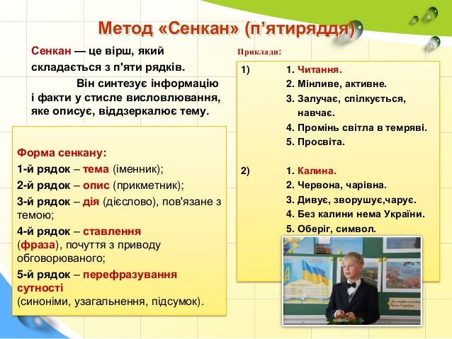 (іменник); 2-й рядок – опис (прикметник); 3-й рядок – дія (дієслово), пов'язане